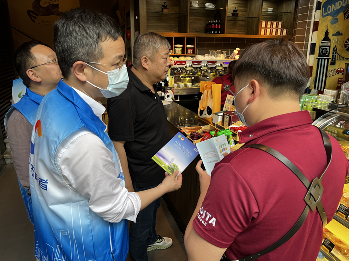 2023年5月31日下午,賀少軍副特派員帶領上海特辦全體黨員干部組成志愿者工作隊,與街道工作人員一起,來到街道商戶最多、最為繁忙的安福路開展志愿活動,沿兩側商戶挨家挨戶進行宣傳。每到一家商戶,志愿者都會走進后廚、倉庫等重點區域,協助街道工作人員檢查垃圾桶設置、垃圾分類標識張貼等情況,發現問題、提出建議。同時與商鋪負責人交流,分發宣傳材料,宣傳垃圾分類就是新時尚,垃圾綜合處理需要全民參與,切實把總書記的重要指示精神宣傳到位,推動垃圾分類工作取得實效。